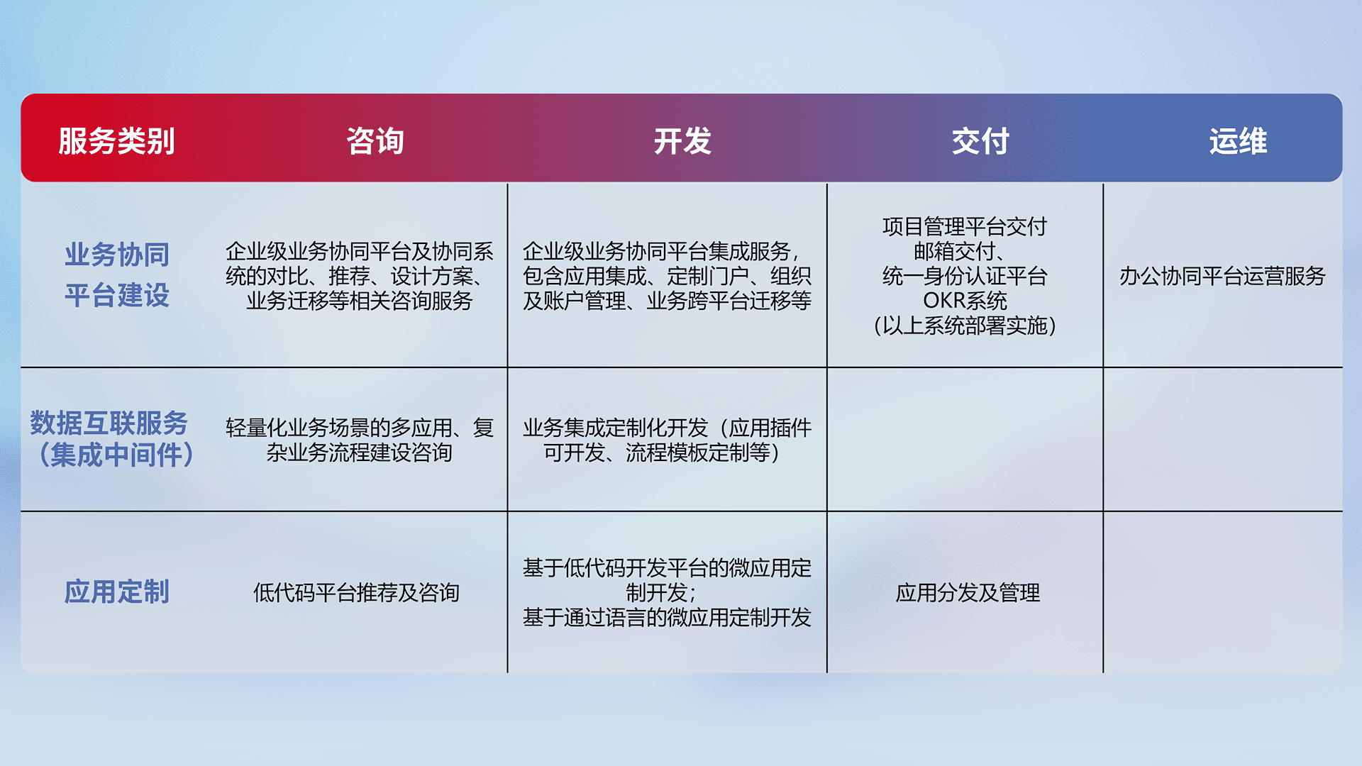 针对钉钉、、企微、、IDaas等平台级产品提供产品的规划、、、方案、、、交付、、定制化开发等服务,,,,实现如统一协同办公、、、、智能客户服务、、混合会议管理、、、智能数据查询、、等业务场景,,,,实现数字化转型。。。。